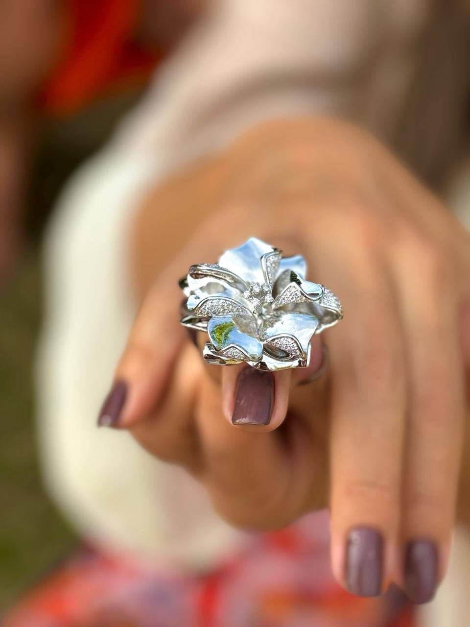 🔸 Design floral com pétalas lisas e cravejadas
