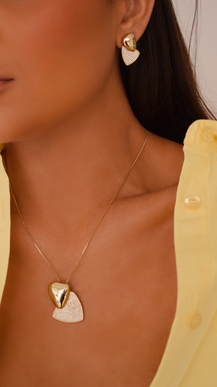 Essa semijoia hipoalergênica é confeccionada em latão de alta qualidade com um refinado banho de ouro 18K, garantindo brilho duradouro e acabamento impecável. A composição de um triângulo liso e outro cravejado com microzircônias cria contraste e equilíbrio, resultando em um visual contemporâneo e elegante.