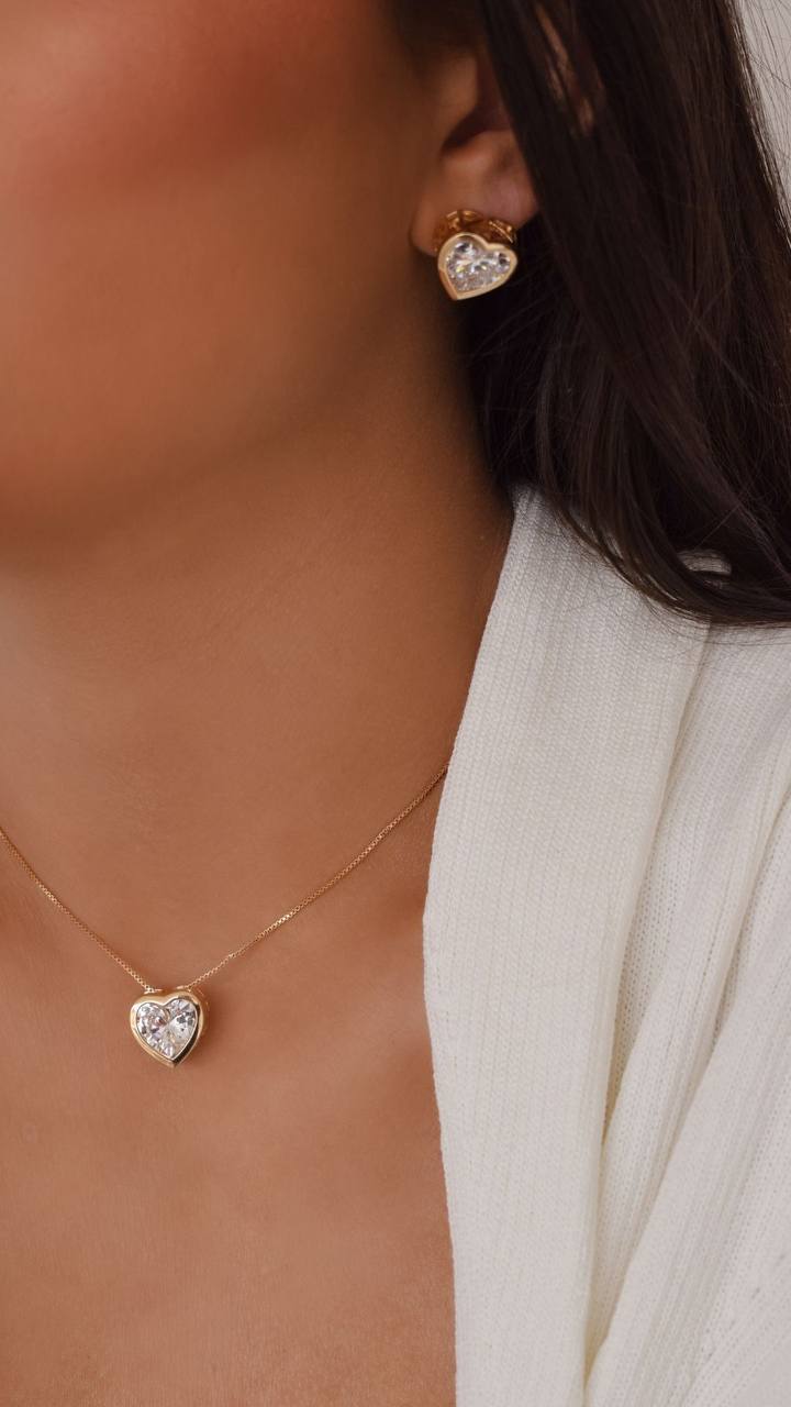 Composto por colar e brincos em formato de coração, este conjunto é uma semijoia hipoalergênica, confeccionada em latão de alta qualidade e finalizada com banho de ouro 18K. As zircônias delicadamente cravadas garantem um brilho encantador, ideal para destacar seu visual com elegância e romantismo.